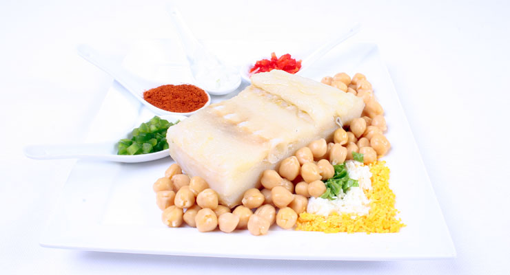 Receitas Bacalhau Cozido com grão de Bico Cozer posta bacalhau ilhamar. Guarnecer com grão de bico o ovo cozido ralado e deve acompanhar com molho cru de azeite alho cebola picada pimentos e colorau.